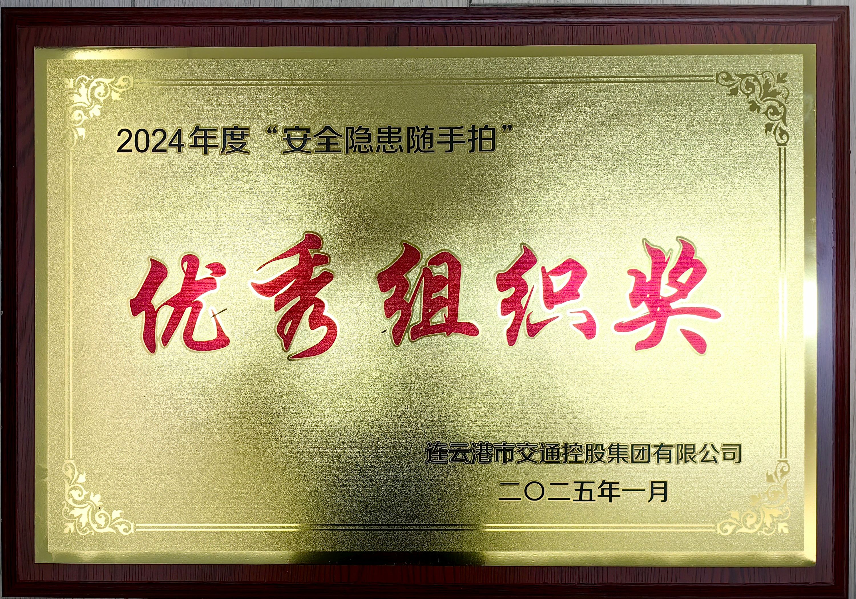 近日,在交通控股集團組織的2024年度“安全隱患隨手拍”活動中,江蘇海建公司憑借出色的組織工作,榮獲“優(yōu)秀組織獎”。這一榮譽不僅是對海建公司安全管理工作的肯定,更是對全體員工安全意識和責任感的認可。