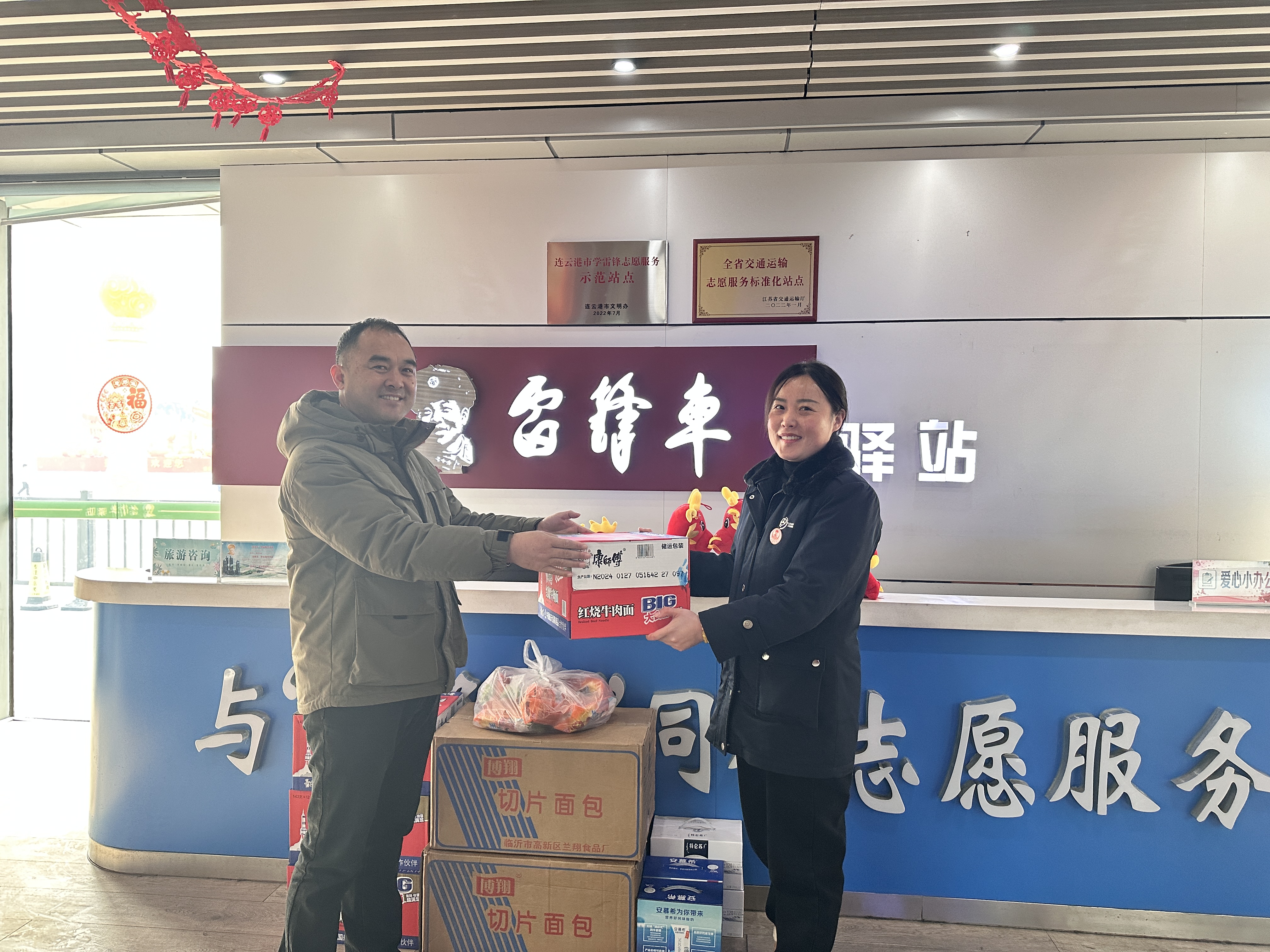 2月8日,在連云港市高鐵站“雷鋒車”驛站前,一抹抹“志愿紅”隨處可見,她們?yōu)榧偃湛土鞲叻遄龊昧藴蕚?。汽車公司工會為堅守在“雷鋒車”驛站的“雷鋒車”手們送上面包、牛奶等慰問品,為他們送去節(jié)日慰問與祝福。為應(yīng)對客流高峰,春節(jié)假期“雷鋒車”手志愿者們要連續(xù)奮戰(zhàn)在高鐵站,開展旅客幫扶、交通指引等工作。汽車公司副總經(jīng)理、工會主席張春軍表示:在春節(jié)出行客流高峰,“雷鋒車”手們堅守崗位,無私奉獻,不折不扣地落實公司的決策與部署,以群眾所需為己任,溫暖旅客回家路,展現(xiàn)了新時代“雷鋒車”手的風(fēng)采。