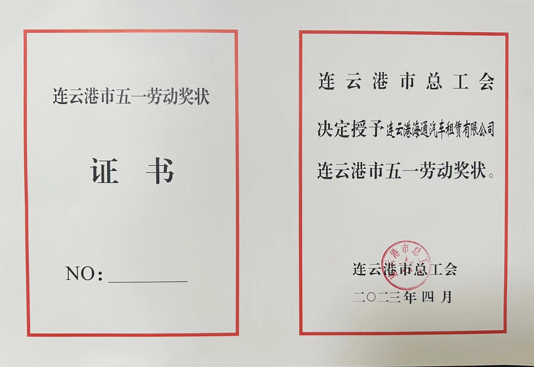 日前,從連云港市總工會傳來喜訊,連云港海通汽車租賃有限公司榮獲“連云港市五一勞動獎狀”榮譽稱號。