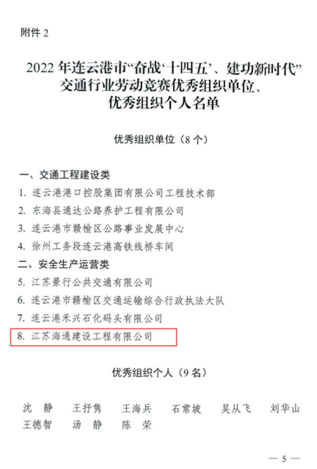 近日,從市總工會(huì)、市交通運(yùn)輸局傳來喜訊,集團(tuán)權(quán)屬公交集團(tuán)公交事業(yè)一部榮獲2022年全市“奮戰(zhàn)十四五、建功新時(shí)代”交通行業(yè)勞動(dòng)競(jìng)賽先進(jìn)集體,海建公司402省道贛榆南環(huán)段工程橋梁班組、汽車公司?;否{駛一班、明茂新能源公司一線運(yùn)維班組和豐達(dá)公司市區(qū)養(yǎng)護(hù)分公司道路施工項(xiàng)目部四個(gè)班組榮獲先進(jìn)班組,公交集團(tuán)周卓文被評(píng)為先進(jìn)個(gè)人,海建公司被評(píng)為優(yōu)秀組織單位。